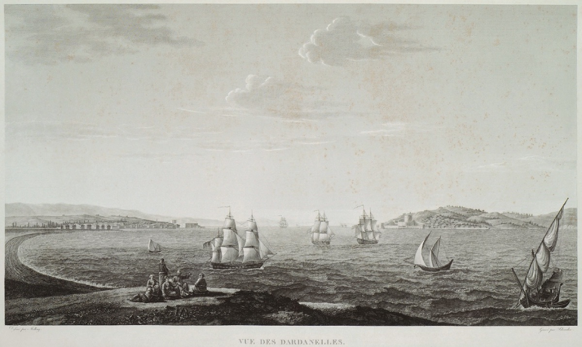 Kısa bir süre sonra Çanakkale Boğazı'ndaki (Dardanellen) Fatih Sultan Mehmed'in yaptırdığı eski kaleler gözüktü. Yine bir yamaca yaslı şekilde yapılmış Avrupa yakasındakinin şekli çok çirkin; Asya yakasındaki ise düz bir şekilde uzayan yere yapılan kale, Çanakkale Boğazı'nın içine doğru çıkmakta. İkinci kalenin önünde geniş bir koy açılmakta, aynısı Avrupa yakasındaki kale için de geçerli; böylece sanki etrafı dağlar ve çok sayıdaki tepeciklerle çevrili, dağlık ve bereketli tarlalarla çevrili bir göl izlenimi vermekte. Özellikle de kuzeyde duvar misali bloğun üzerinden Trakya yarımadası sırtlarının dağ zirvesi ön plana çıkmakta. Asya kalesine doğru yaklaştık, çoktan akşam olmuştu. Çok sayıda ticaret gemisi bekliyordu; bir Türk savaş gemisi ve bazı savaş filosu'da Çanakkale Boğazı'nın ortasına demir atmıştı.