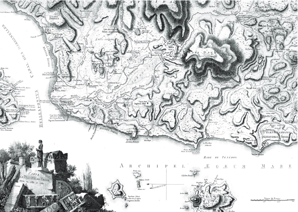 Sabah erken saatte, çok sakin bir havada. Yeniköy'den hareket ederek Çanakkale Ağzı (Hellespontus)'nı geçebilmek için, bütün gün tramola yapmaya mecbur kaldık ve nihayet, Anadolu Yeni Hisarı yöresinde, tabiri caizse tutunabildik. Büyük yorgunluk pahasına da olsa, iki veya üç tramola daha yaptıktan sonra, lütfunu bizden esirgemeyen rüzgarın yardımıyla, hisardan iki Leage daha ilerledikten sonra, gecenin çok karanlık ve kanalın çok dar olması nedeniyle, kaptanımız kalyona demirlemeyi münasip buldu. Bu yerde Troya'nın tarihini anımsamak çok doğaldı. Berrak ve sakin bir havada kıç üstü kamaradan sınırsız bir merakla, gözlerimi ve beynimi besleyerek, Troya kentinin tekmil kıyılarını uygun bir uzaklıktan seyrettim. Strabo'nun şimdiki Rumlara göre eski denilen Troya alanı, geniş manasıyla, Bababurnu dağlık burnundan başlayarak Bozcaada karşısında, tatlı yeşil bir arazide, Çanakkale Boğazına kadar uzanıyordu. Biz bu boğazın başından özellikle, Troya sahrası denilen kara parçası civarına kadar yelken açmıştık. Bu ünlü yerin öyküsünü şimdiki gezginler, belirsiz ve yanlış anlattıkları için, mevkiini ve sınırlarını mümkün olan açıklık ve belirli terimlerde tarif etmeye gayret ettim.