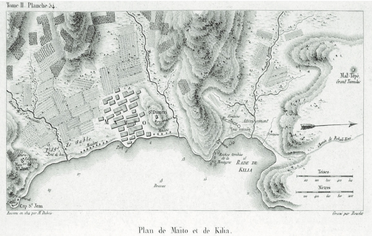 Gelibolu Yarımadası'ndaki Kilya Koyu ve Çeveresi (1784, Aguste de Choiseul-Gouffier) Maksatsız geçen bir zamanı takdir etmesem de beklenmeyen makul bir fırsattan faydalanarak, iki ünlü hisarı ve bitişiğindeki kasabaları görmek beni ziyadesiyle memnun etti. Kaptanın filikasıyla kıyıya çıkarak Asya tarafındaki kasabanın (Abydos) civarına kadar büyük bir zevkle yürüdüm. Kent büyük fakat basit olduğu gibi, arkeolojik hiç bir ize de rastlanmıyor. Kasabada Doğuya mahsus güzel sırlı testiler yapılarak satılıyordu. Tam dörtgen olan hisarın her köşesinde bir tabya yükseliyordu. Sulu hendeklerle savunması takviye edilen kalede örnekleri Türkiye'nin pek az bölgelerinde görülebilecek çok büyük yirmi veya otuz kadar top vardı. Tunçtan yapılmış topların çapları üç çeyrek yardaydı. Topların yanlarında özel yontularak yapılan taş gülleleri vardı. İzmirli Barut Ağa'nın yerinde verdiği bilgiye göre, barut hakları yüz beş okkaydı. Anadoluhisarı'ndan Sestos'a bir sandalla geçtim ve yolda Strabon'un anlattığı akıntının kuvvetinden kurtulmak için kayıkçının maharetini gördüm. Kasaba, deniz kenarına doğru dik inen bir uçurumun kenarındadır. Abydos'tan sonra daha ufak olmasına rağmen, daha iyi imar görmüştü. Yüksek yonca biçimli bir surla çevrili üçgen kulesiyle, çevresi derin hendekle çevrili yonca biçimli surla savunması kuvvetlendirilmiş bir hisarı vardı. Anadoluhisarı'ndaki topların aynı veya daha büyüklerinden tahminen otuz kadar top, deniz seviyesinde olarak bu Rumelihisarı'na tabiye edilmişlerdi. Her bir topun yanında, çapına uygun küresel yontulmuş taş gülleler yığılmışlardı.