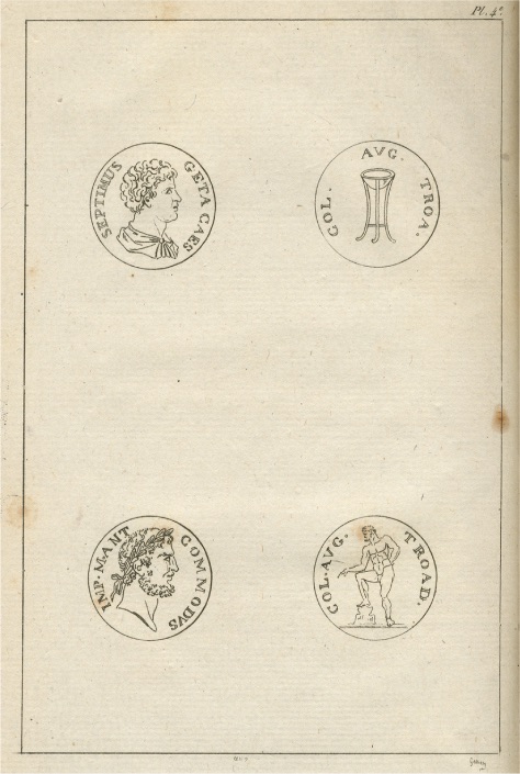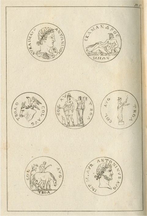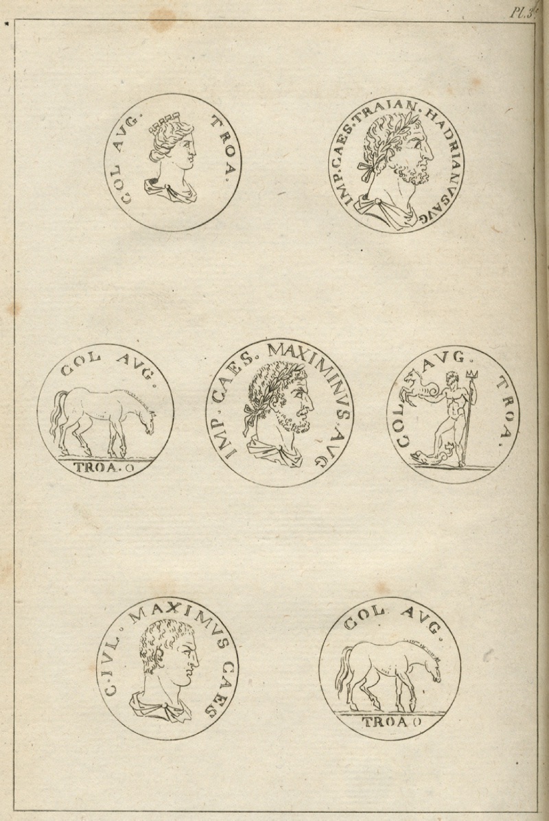 Troas Bölgesinde Bulunan Sikkelerden Örneknler (1786, Jean –Baptiste Lechevalier) Bir elimizde iskandil aleti, ötekinde not defterlerimiz, Çanakkale boğazının her iki sahilini de adım adım dolaşmış, derinliklerini ölçmüş ,birçok yerlerde arazinin içlerine kadar girip durumlarını, yetiştirdikleri ürünleri, izlenimimizle birlikte tespit ve kayıt etmiştik. Şimdi artık gözlerimizi Truva beldesine çevirmenin, daim Yunanlılarla Romalıların savaş dehalarının unutulmaz bir üne kavuşturduğu bu bölgeleri incelemenin artık zamanı gelmişti. Pluvisoe ayının onuncu günü (İhtilal takviminin beşinci adı-21 Ocaktan 20 Şubata kadar uzanır) Çanakkale'den bir Türk yelkenlisine bindik. Kuzeyden esen soğuk bir rüzgârın yardımı ve gayreti ile 1'inci Asya kalesinin önüne gelebilmek için iki saat yeterli geldi. Karaya çıkınca eşyalarımız yatak ve yorganlarımız ve erzaklarımızla birlikte doğruca Siegee burnundaki küçük bir Rum köyüne gittik. Burada daha rahat edeceğimizi düşünüyorduk. Müslüman Türkler, yabancıların etrafı gezip görmelerinden, kolaçan etmelerinden hatta fazla tecessüs göstermelerinden pek fazla hoşlanmazlar. Bu bakımdan onların kuşkulu bakışlarından uzakta, gözlemlerimizi daha rahat yapabilecektik.