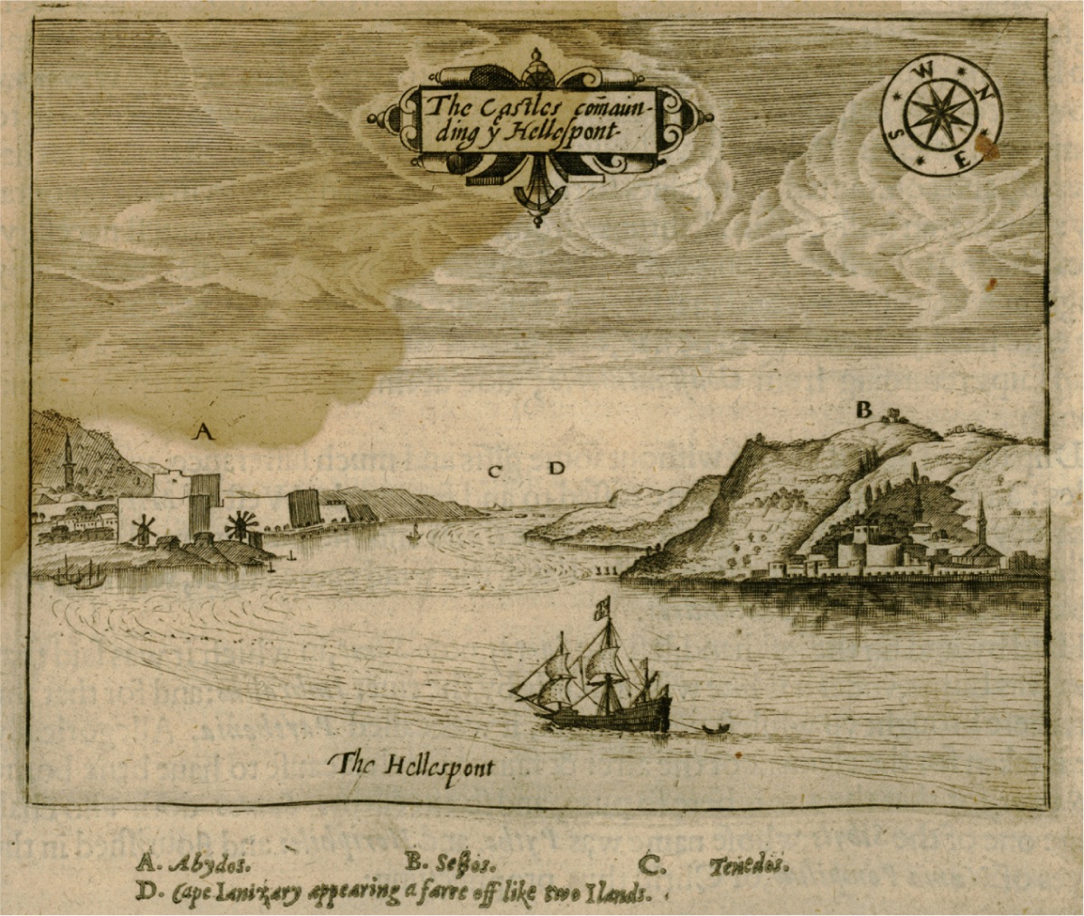 Girişten yaklaşık üç league (1 league yklş. 5, 6 km R.A) sonra; boğazın en dar yerinde, şair Musaeus'un şiirleştirdiği, azgın dalgalarda boğulmuş Hero ve Leander'in hüzünlü aşkıyla bilinen, karşı karşıya yapılmış Sestos ve Abydos kentleri var. Burada Kserkses büyük ordusuyla ıslanmadan boğazı geçmiş ve dağları aşmıştır; geçmişte Grek yurdunda gemilerden köprü yapıldığı söylenmekte...