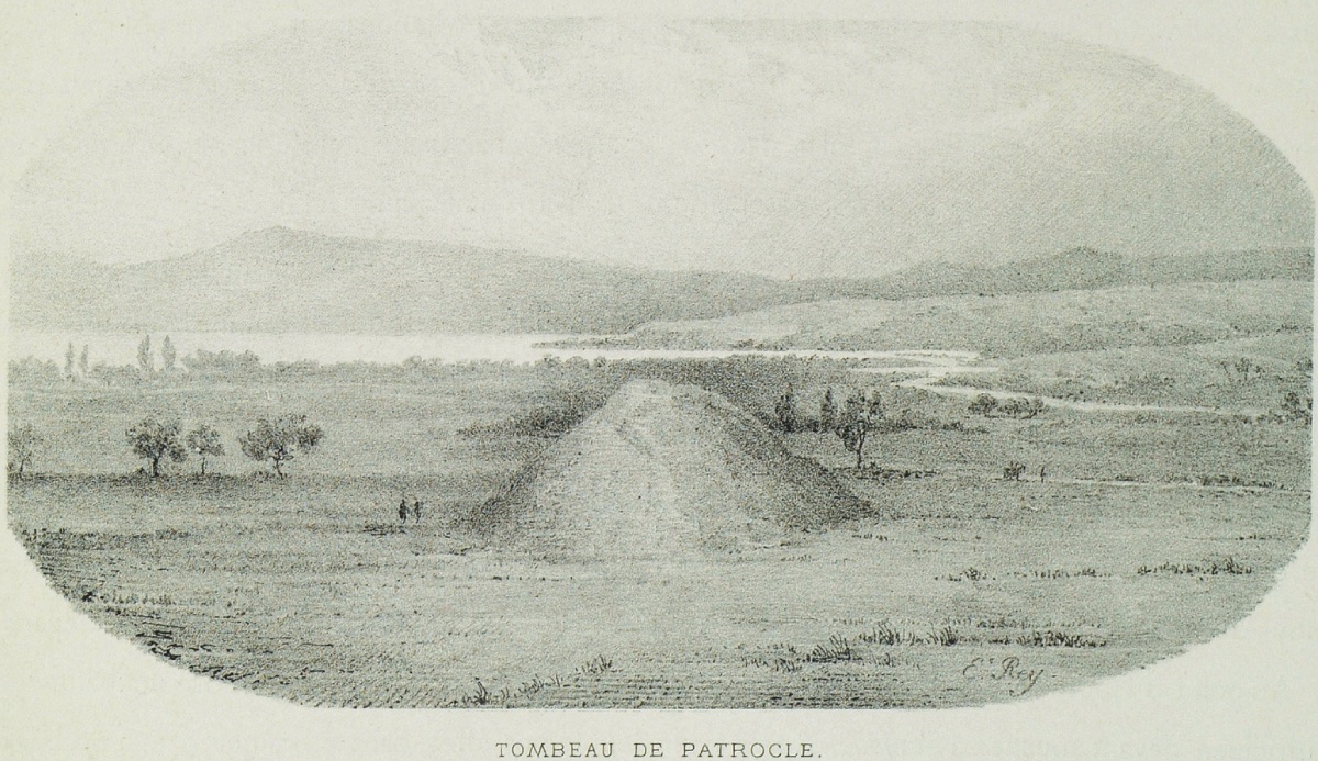 Bu sabah Fransız filosuna kumanda eden Amiral de la Susse'nin yerine Amiral Hamelin'in geçeceğini öğrendik. Amiral Susse Fransız donanmasında yaş haddi olan altmış beş yaşını doldurmuş. İngiliz Amiral onunla birçok defalar görüşmüş, onu çok seviyor. Kaptanlarımızdan birçoğu gemiye geldi. Kocaman filonun bu canlılığı, her ne kadar mürettebat Beşike Körfezi'ndeki monotonluktan şikâyetçi olsalar bile, beni çok neşelendirdi. Burada bir aydır bulunuyorlarmış. Yemekten önce ve sonra olmak üzere iki defa karaya çıktım. Gezdiğim yerlerden bir tanesi bana Karamenderes (Skamandros) olduğunu söyledikleri yerin ağzında idi. Suyun çok berrak olması beni çok sevindirdi. Suyun berraklığı nehirlerin güzelliğine ilk katkı ve aynı zamanda gemiler için de bulunmaz bir nimet. Uzun uzadıya giden nehrin genişliği aşağı yukarı bir buçuk metre kadar. İnsan bu nehrin sularının Xerxes'in ordularına niçin yetmediğini ve Çanakkale Boğazı'na niçin geniş denildiğini rahatlıkla anlayabiliyor. Aniden bir şehir göründü. İçki, çubuk, İran halıları satan bir sürü dükkân gördük. Aşil burada olsaydı da görseydi, şüphesiz böyle şeyler satan dükkânlar olmazdı. Akşam yemeğinde buharlıların kaptanları da aramızdaydı. Zeki adamlar. Amiralin bize ikram ettiği kaplumbağa ve Berkshire usulü pişmiş pirzolayı iştahla silip süpürdük. Bundan daha mükemmel bir yemek bulunmaz yeryüzünde. Amiral Hammelin bu gece geldi.. Eski Kumkale Yakınlarındaki Patroklos Tümülüsü (1843, Etienne Rey)