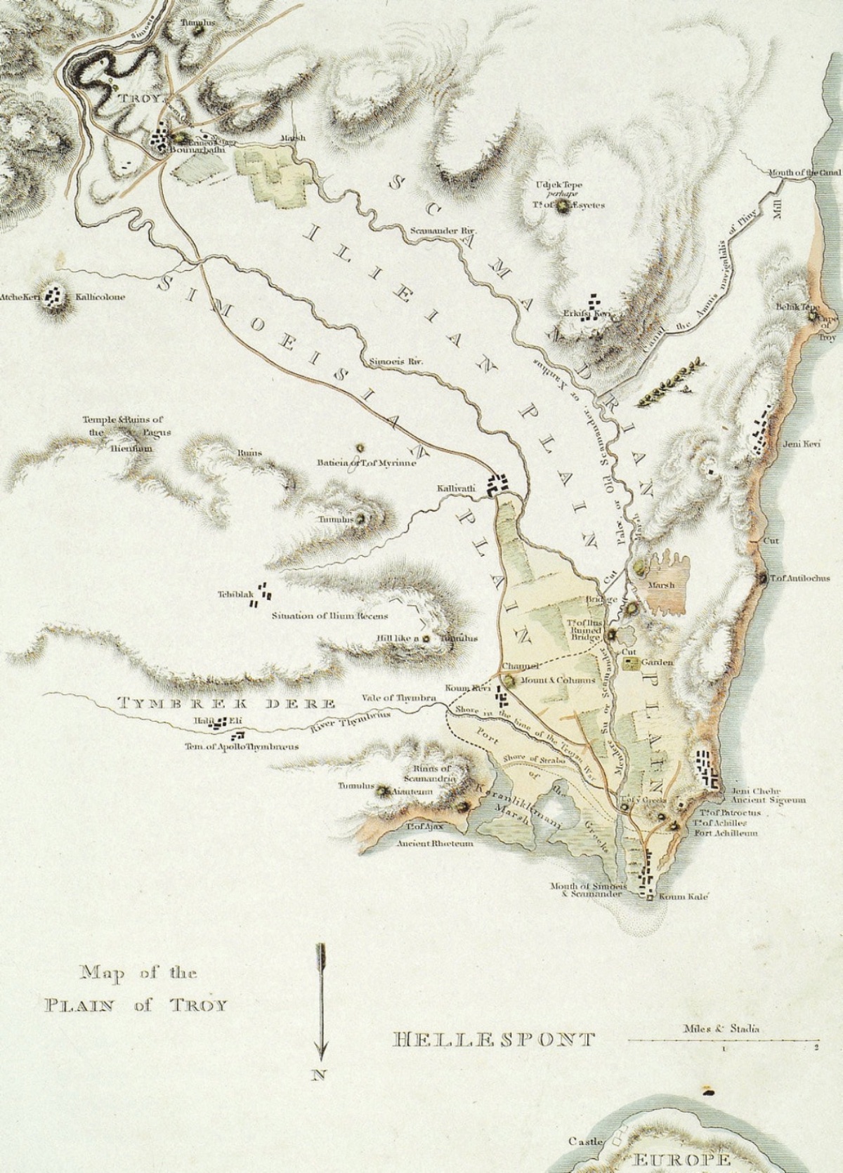 Çanakkale Boğazı (Hellespont) kıyısı boyunca atla ilerlerken sağ ve solda daha henüz araştırılmamış birer tane tümülüsün yanından geçtik. Buradan sağa doğru bir tür tepeye benzeyen, Strabon'un birçok kere değindiği (XIII, 587, 590,595, 600) Aiol kenti Dardanos'un (ancak bunun Homeros'un bahsettiği Dardania (İlyada XX, 216) ile karıştırılmaması gerek) kurulduğu yerden geçtik. Strabon'un bize aktardığı gibi (XIII, 595) Cornelius Syla ve İmparator VI. Mithridates buraya barış antlaşması yapmak için gelirler. Benim ısrarlarımla, Dardanellen (Çanakkale) askeri valisinin burada yaptırdığı kazılar, buradaki toprak kalıntısının sadece 60 ile 90 cm kalınlığında olduğunu ve neredeyse sadece humuslu topraktan oluştuğunu gösterdiği için, burada eski çağ bilimleri açısında bulunacak bir şey yok. Schliemann Kazıları Sırasında Troya ve Yakın Çevresi (1874, Heinrich Schliemann)