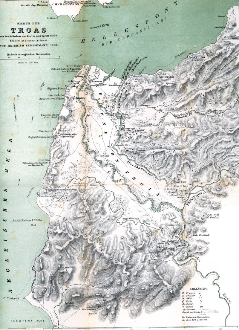 Schliemann Kazıları Öncesi Troya ve Yakın Çevresi (1801, William Gell) 1822 yılında Kuzey Almanya'nın Meklenburg kasabasında doğan Schliemann, fakir bir çocukluğun ardından Hamburg'da küçük bir çırak olarak ticaret hayatına ilk adımını atar. Daha sonra dönemin en önemli ticaret merkezi Amsterdam'a giden Schliemann, burada yabancı dillere olan kabiliyetiyle kısa sürede başarılı olur ve büyük bir firmanın temsilcisi olarak Moskava'ya gider. Orada kısa sürede kendi adına ticaret yaparak büyük bir servete sahip olur. Moskova yılları sırasında bir Rus kadınla evlenen Schliemann'ın iki çocuğu olur. Evliliği ve hayata bakış açısı değişen Schliemann, karısından boşanır ve tüm hayatını Homeros'un Troya'sını bulmaya adar. Bu amaçla ilk kez 1868 yılında Çanakkale bölgesini ziyaret eden Schliemann, o dönemde Troya olduğuna inanılan Pınarbaşı Köyü'nün yakınlarındaki Ballıdağ'da on günlük bir kazı yapar, ancak hayal kırıklığına uğrar. Atina'ya dönüş yolunda Çanakkale'de yaşayan ve İngiltere'nin konsolosluk görevini yürüten Calvert ailesinin en küçük üyesi Frank Calvert ile tanışması hem kendisinin hem de Troya'nın kaderini değiştirir. 1863 ve 65 yıllarında Hisarlık Tepe'nin Troya olduğuna inanarak burada küçük çapta kazılar yapan Frank Calvert'in de yardımıyla Schliemann, Troya'daki çalışmalarına 1870 yılında başlar. Troya çalışmalarına başlamadan kısa bir süre önce ise Atina'da yaşayan Yunanlı bir genç kız olan Sophia ile evlenir. Schliemann'ın büyük çaptaki kazıları 1871 yılında başlar ve 1873 yılında Troya Hazinelerini bulması ve kaçırmasına kadar devam eder. 1875 yılında Osmanlı Devleti ve Schliemann arasında Atina'da zorlu bir mahkeme süreci yaşanır. Osmanlı Devleti uzun uğraşların sonunda hazineleri geri alamayacağını anlayınca Schliemann'la anlaşır ve 50.000 altın frank karşılığında davadan vazgeçer. Ancak bu dava sonrasında Osmanlı Devleti ile Schliemann arasındaki ilişkiler oldukça sorunlu geçer. Schliemann, 1890 yılındaki ölümüne kadar, aralıklarla kazılar yapar. Kazı yöntemi ve buluntulara yaklaşım tarzıyla Troya höyüğüne ve buluntularına büyük zarar veren Schliemann, 1881 yılında Hisarlık Tepe/Troya'nın bölgedeki en büyük ve önemli yerleşme olduğunu ispatlamak amacıyla ayrıntılı bir gezi yapar. Söz konusu o gezi izlenimlerini aynı yıl kitap olarak yayınlar. Bu yayında 1881 yılındaki Çanakkale Bölgesi'nin (Troas) etnik ve kültürel yapısı konusunda oldukça ilginç bilgiler yer almaktadır: