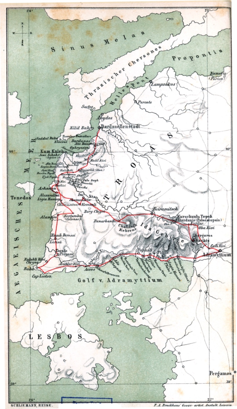 Troas'ı pek çok kere ziyaret ettim, beş yıl orada aylarca kazılar yaptım ve buna rağmen halen büyük bir mutlulukla Troas coğrafyasının her noktasından etkilenmekteyim, çünkü buradaki her dağ, her vadi her nehir ve Çanakkale Boğazı (Hellespont) denizi Homeros ve İlyada'yı soluyor. Ama bu kez Troas gezimin çok özel bir amacı var; çünkü amacım Hisarlik'tan başka hangi kalıntıların arkeolojik araştırmalar için uygun olduğunu saptamak.