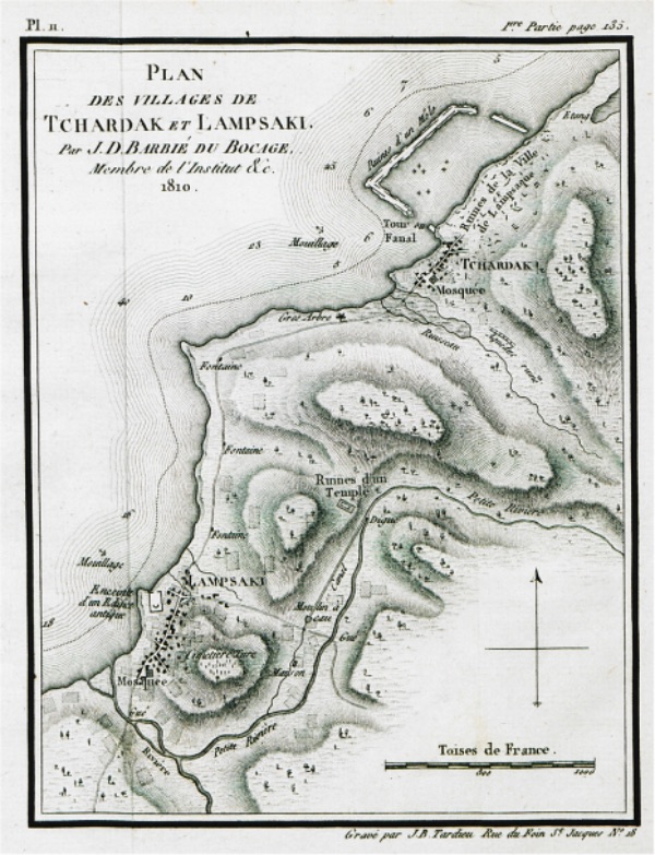 Lapseki ve Çevresi (1811, Antoine-Laurent Castellan) Bir gemide uzun süre kapanmış, kısıtlanmış ve hapsedilmiş olmaktan yorgun ve biran önce toprağa ayak basmak için istekli bir şekilde, çapa atılır atılmaz gemiden ayrıldık ve yakın mesafede olmasından dolayı, kısa süre içinde kıyıdaki Tenedos şehrine adım attık. Kuzey tarafı güçlü ve büyüklüğünü görebilmemizi sağlayacak kadar beyaz tahkimatla gölgelenmiş bu küçük limana girdiğimizde hava zaten kararmıştı. Liman neredeyse mümkün olan her çeşitte inşa edilmiş küçük teknelerle dolmuştu ve karaya çıkılacak yere ulaşmayı başarmamız zor olmuştu. Burada kibarca ne yaptığımızı soran ve et, şarap vb. İnsani konforları elde etmek için sabırsızlandığımızı öğrendikten sonra, bizi İngiliz konsolosunun evine kadar götürmeyi teklif eden bir Türk güvenlik memuru ile karşılaştık. Bizi şehrin merkezine getiren kısa bir yokuşu tırmandık.