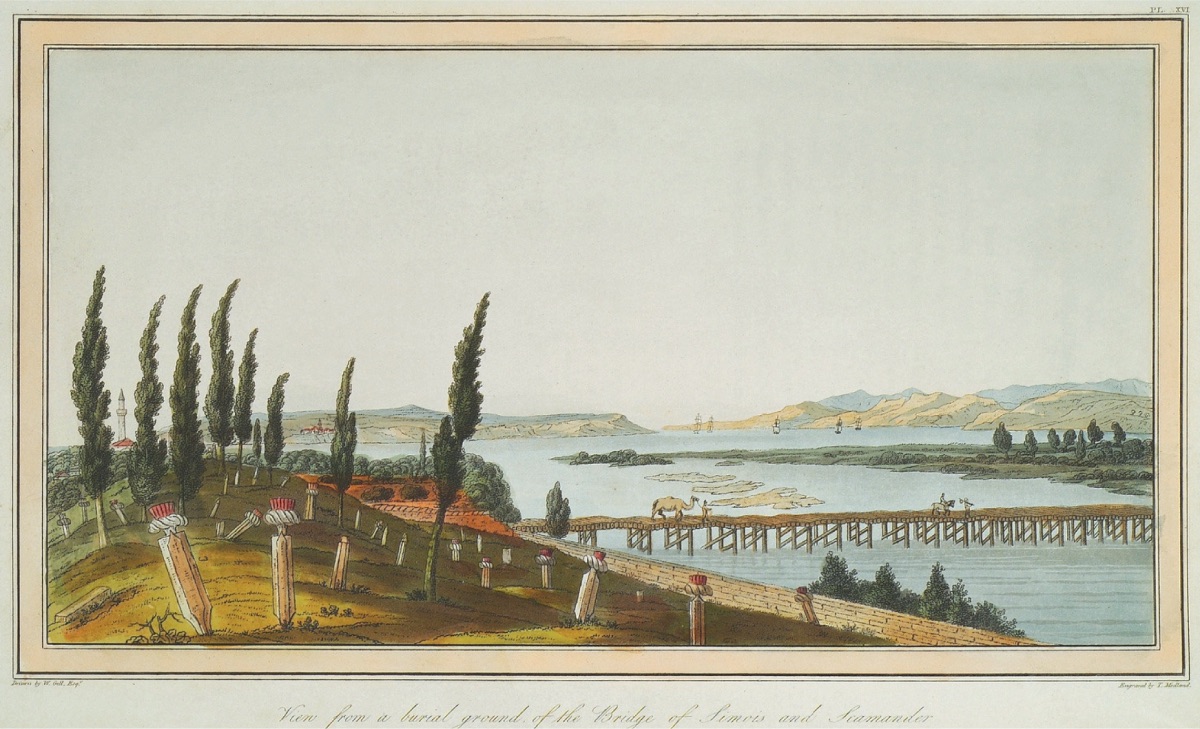 Karamenderes Nehri'nin Boğaza Döküldüğü Yerdeki Eski Kumkale Mezarlığı ve Ahşap Köprü (1801, William Gell) Bağlarla çevrili pek çok arazi var, ancak bozulmuşlar. Bozcaada (Tenedos) limanı öylesine yeni gözüküyor ki, sanki daha dün ustalarca yapılmış gibi. Mendirek büyük taşlar ve sütunlardan yapılmış ve burada gemiler için çok güzel çapa atma ve demirleme yeri. Gemilerin çapa atması için başka yerler de var, ancak burası, Dardanelles/Çanakkale Boğazı (Romania) girişinin karşısında olduğu için, en uygunu burası. Limanın üstünde büyük bir tepenin üstünde güçlü bir kale var. Bu kale Venedikliler ve Cenevizliler arasında pek çok çatışmanın çıkmasına neden olmuş, bunun üzerine Papa kimseye ait olmaması için, ceza olarak kaleyi yıktırmış. Bu aslında kötü bir çözüm, çünkü liman dünyadaki en iyilerinden. Hiçbir gemi ilk önce burada demirlemeden çok dar olan boğazı geçemez. Türklerin ne kadar gemiyle orada temas ettikleri, aldatarak bekleyip pek çok Hristiyan'ı öldürdükleri bilinmekte. Oradan Troya'nın pek çok binası görülmekte, hiç kuşkusuz orada yaşayan Grekler bu yerle ilgili bilgi verebilirler.