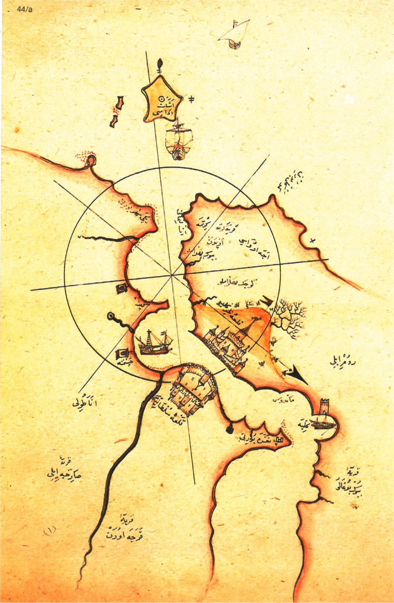 Çoğu zaman, harami (korsan) gemileri de gelerek, adı geçen Bozcaada'nın limanına gizlenirler. Ticaret için gelip giden gemiler geldiğinde, üzerlerine vararak, mal ve eşyalarını ellerinden alarak pek çoklarını yoldan azdırdıklarından dolayı Venedik ve Cenovalı tüccarlar bir araya gelerek, sözü geçen adada bir kale inşa ettirmişlerdir. Bu kalenin yapılmasıyla o zamanın tüccarları güvenlik içinde oldular. Daha sonra, bu yörelerde Müslümanlar muzaffer olup, fırsat ve zafer buldukça Eski İstanbulluk harap olmaya yüz tutmuştu. Ondan başka Anadolu kıyılarında bulunan şehirlerden ve kalelerden feth olanlardaki dinsizler de artık buralarda kalmaya güç yetiremediler. Bunlar, şehirlerini terk edip Avrupa'ya gitmeye niyetlendiklerinde, Bozcaada'da kendilerinin yaptığı kaleyi de harap edip öyle gitmişlerdir. Çanakkale Boğazı ve Gelibolu Yarımadası (1513, Piri Reis)