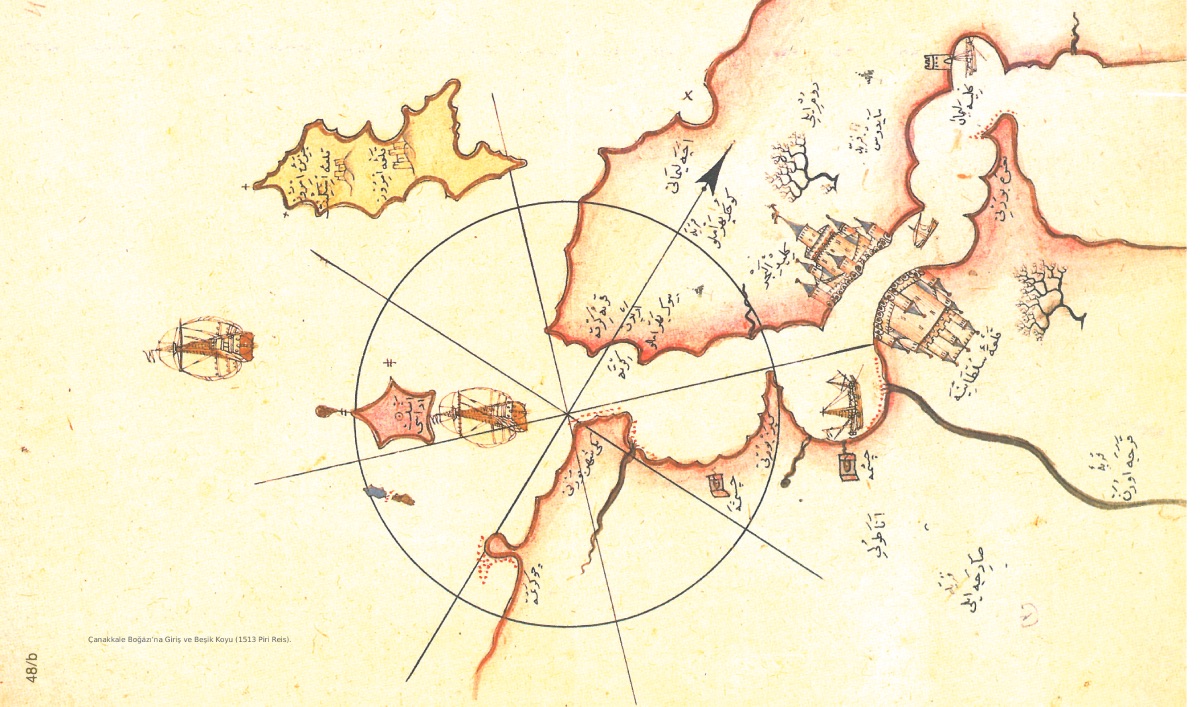 Çanakkale Boğazı'na Giriş ve Beşik Koyu (1513, Piri Reis) Şimdi bu adanın iki kalesi vardır ve bakımlıdır. Bu kalelerden birisine İskinit derler. Sözü geçen adanın orta yerinde, denizden uzakta, büyük bir kayanın başında inşa edilmiştir. İkinci kalesine ise İmroz derler. Bu kale adanın karayel tarafında, deniz üzerinde havale, büyük bir kayanın üzerinde bina edilmiştir. Bu kalenin altında bağların önünde küçük bir körfez vardır. Bu kaleye gelen gemileri, bu körfezin dibinde kıyıya çekerler. Açık yerdir. Büyük gemiler yatamaz.
