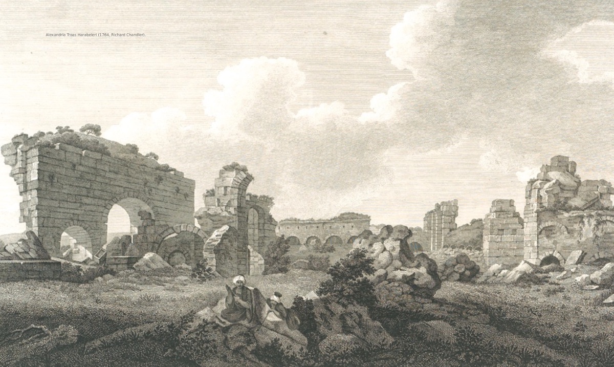 Alexandria Troas Harabeleri (1764, Richard Chandler) İngiliz Gezgin ve araştırmacı Richard Chandler (1738-1810), klasik Yunan Roma antik dönem kültürünü araştırmak için bilgi edinme amaçlı, 1734 yılında, zengin ve soylular tarafından Londra'da kurulmuş bir dernek benzeri kuruluş olan Society of Dilletanti'nin Grek kültürünü araştırması için Ege'ye yolladığı ilk kişidir. Chandler'in bu misyon için seçilmesinin nedeni ise o dönemin en önemli Homeros uzmanı olan Robert Wood'un onu bu ilk misyon için önermesiydi. Richard Chandler, gezisine yanında mimar Nicholas Revett ve ressam William Pars ile birlikte çıkar. Misyonun tek amacı Anadolu ve Yunanistan'daki antik dönem eserlerini belgelemek ve incelemekti. 1764 yılının Haziran ayında Çanakkale Boğazı ve Anadolu kıyıları için yelken açarlar. Chandler'in bu gezisi 18. yüzyılın antik dönem kültürü için yapılmış en önemli gezi olarak kabul edilmektedir. Ancak Chandler, anlatımlarında Türk kimliğine karşı katı ve zaman zaman ön yargılı bir şekilde yaklaşmış ve ötekileştirmiştir:
