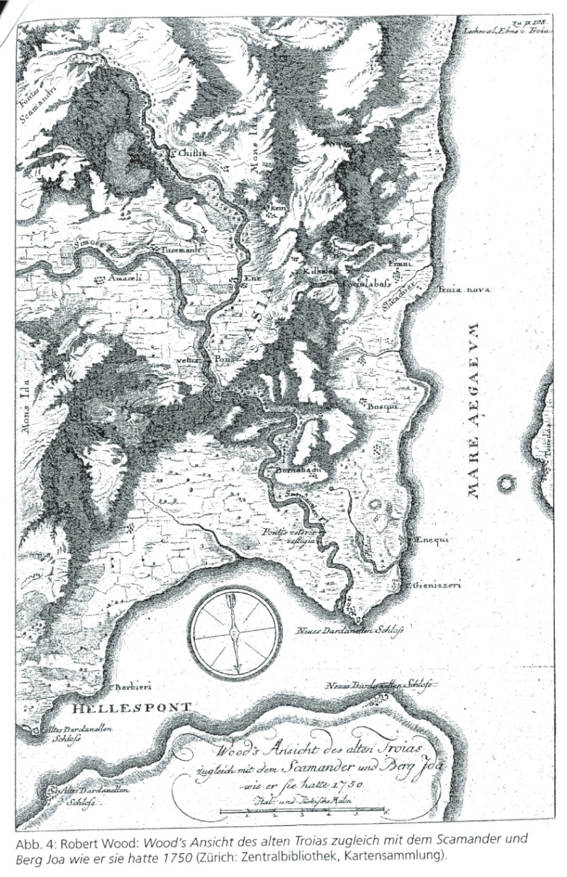 Çanakkale Boğazı'nın (Hellespont) girişindeki Avrupa kıyılarındaki ilk kalenin yakınındaki yerleşmede fakir bir Yahudi'nin çok kötü durumdaki kulübesine çıktık. Burada deniz kenarına doğru, üzerinde bir örtü olan toprak tabanlı bir odada yemekler hazırlandı. Öğle güneşi dayanılacak gibi değildi. Konsolos her zaman olduğu gibi uyudu; biz de dinlenmeye çekildik ya da pencereden manzaranın keyfini çıkardık. Altımızda parıldayan Çanakkale(Hellespont) vardı. Sağımızda Mastusia burnu, karşıda Asya kenti ve kalesi, Karamenderes tarafından (Skamender) bölünen güzel ova ve daha önce sözünü ettiğimiz tepecikler, iki tanesi kıyıdan çok uzakta değil, Sigeon'un üstünde ve çok uzağında değil.