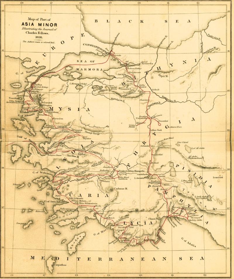 Assos Harabelerindeki Kalıntılar (1838, Charles Fellows) Bir İngiliz arkeolog olan Sir Charles Fellows (1799-1860), çocukluk yaşlarından itibaren resimler çizmeye başlamıştır. Bu resimlerin bir tanesi Lord Byron'un kitap kapağında kullanılmıştır. 1820 yılından itibaren sürekli olarak Londra'da yaşamaya başlar. 1832 yılından sonra İzmir'e yerleşir ve oradan İtalya, Yunanistan ve doğu ülkelerini; ama özellikle Batı Anadolu kıyılarını kapsayan yolculuklarına başlar. Fellow ayrıca bu yolculuklarda çizdiği resimleri Lord Byron'un "Childe Harold" eserinde kullanır. 1838, 1839 ve 1848 yılındaki seyahatlerinde o döneme kadar çok bilinmeyen Lykia bölgesini dolaşır. Sadece 1842 yılında Fellows sayesinde yetmiş iki heykel ve mimari eserler Londra'ya yollanır. 1843 yılında Fellows, buluntularını üç cilt halinde, ancak bilimsel olmayan bir tarzda yayınlar. Fellows'un o dönemlerde İngiltere'ye yolladığı eserlerin büyük çoğunluğu British Museum'dadır ve genel olarak "Ksantos Mermerleri" olarak bilinir. Yaptığı bazı yayınlara dayanarak, British Museum yetkililerine, Lykia eserlerinin Londra'ya taşınması için, İstanbul'daki İngiliz Büyükelçisinin, padişahla konuşmasını önerir. Bu öneri sonrasında pek çok eser İngiltere'ye taşınır. Fellows, gittiği yerlerdeki modern yer isimlerinin antik isimleri ile olan ilişkisi ve aynı zamanda bölgesel etnik grupların yaşadığı kültürel sorunlara da değinir. 1838 yılında yaptığı Çanakkale gezisinden de bu tür ayrıntılar yer almaktadır. İzmir ve Bergama üzerinden bölgeye gelen Fellows'un gözlemleri, kendisinden sonra gelen seyyahlara büyük kolaylıklar sağlar: