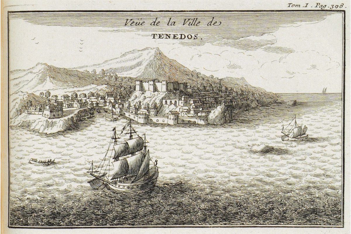 Burada kıyı yoğun ve hep yeşil kalan bir meşeyle dolu ve dünyanın farklı bölgelerine ihraç edilen meşe palamudu (Quareus Aegilops) ismiyle bilinmekte. Manzara, en yüksek noktası (Mons Gargarus) günümüzde Kazdagh ya da Kazların Dağı olarak bilinen İda Dağıyla sınırlanmakta. Türkçesi Bozcaada olan Tenedos köyü ve boğa limanı, gemimizin hemen karşısında yer alıyor; Gari isimli küçük kayalık adacık buradan uzakta.
